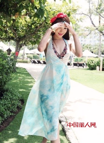 清爽女人味的水纹图案连衣裙,清爽感的水纹图案,也很有女人味。前面衣领开衩比较低,可以搭配比基尼穿。很有女人味的款式,具有性感的魅力。挂脖肩带的设计在海边更有风情。