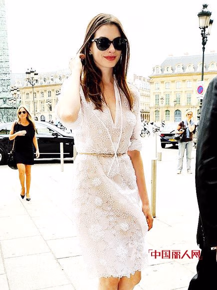 安妮-海瑟薇穿着Valentino纯白色蕾丝连身裙