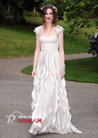 Anne Hathaway这几次亮相中最让人觉得惊艳的还是 “白色童话爱情舞会” (The White Fairy Tale Love Ball)中的造型,她变身美丽的“白雪公主”十分抢镜。