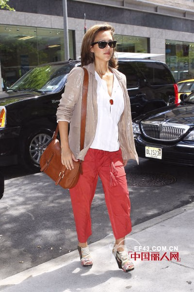 孕期中的杰西卡-艾尔芭(Jessica Alba)从自己家中走出,即使休闲出行也是名牌加身,小编现在跟大家一起解读之:墨镜来自雷朋,棕色单肩挎包来自Longchamp,泛光金属外套来自 Yoanna,红色宽松系带裤子来自Diane von Furstenberg,图案及踝凉鞋来自Aldo。
