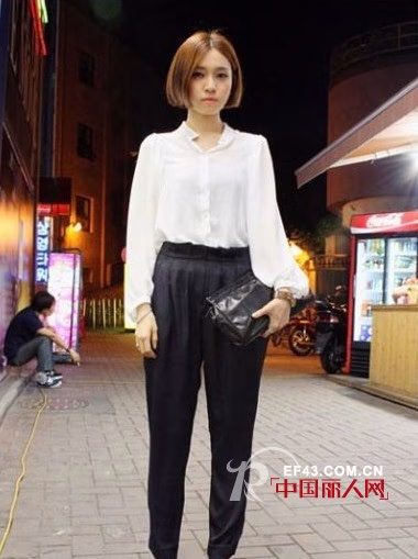 白衬衫与西装裤的搭配本让人觉得很严肃很呆板,但MM选择了高腰的款式,一双新潮的凉鞋与手拿包,有了时尚的感觉。