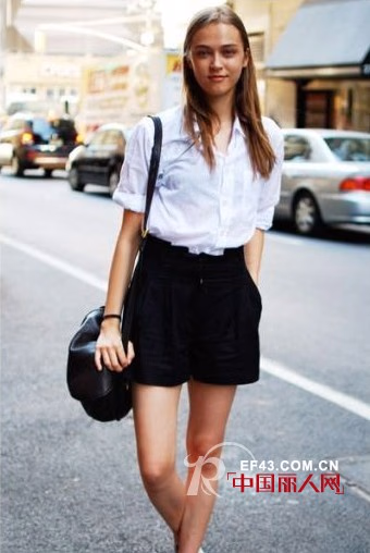 白衬衫搭配上黑色高腰短裤,即使是穿着平底鞋,腿也显得很修长。