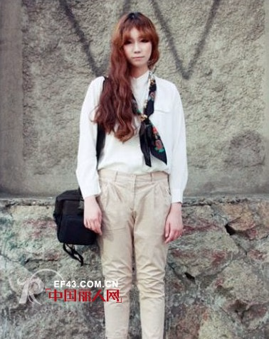 白衬衫、高腰裤、运动鞋,你能想象它们搭配在一起的效果么,丝巾的加入无疑给整体加分不少。