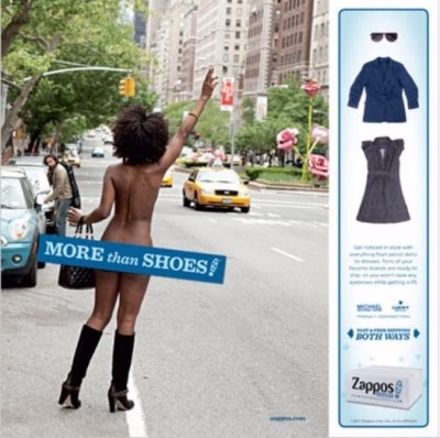 网上零售商Zappos品牌在最新的广告中让模特全裸,出现在曼哈顿的街头跑步,骑车或是拦出租车等。每个模特的关键部位都有一条蓝色封条阻挡,当面印有"不仅仅是鞋子"的标语,以此来为品牌造势。
