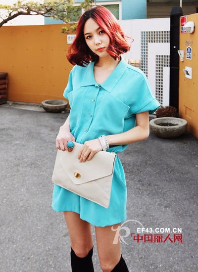 荧光蓝色的连体裤,短裤的款式性感迷人,公文包和配饰相当有范!