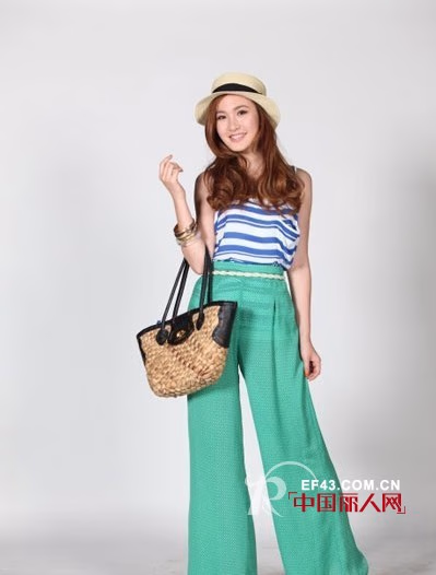 蓝白色无袖背心,搭配孔雀绿阔腿长裤,大大提升腿部长度。搭配一个布帽,尽显妩媚。麻绳类腰带立即使腰围显瘦,整个人高挑不少哦。