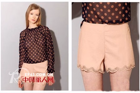 裸色短裤是夏季最具代表性的时尚着装。粉嫩的颜色透出你的可爱气质,波点雪纺上装既有设计感同时还可以秀出迷人的小蛮腰。镂空花边的设计在造型上有加分的效果,让腿部视觉看起来更为修长。