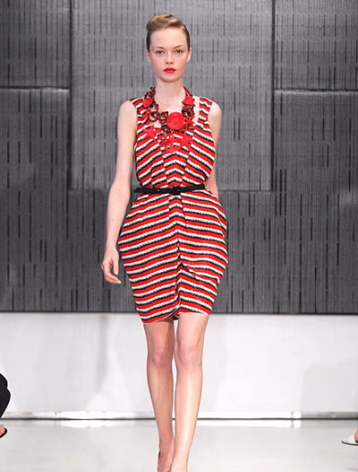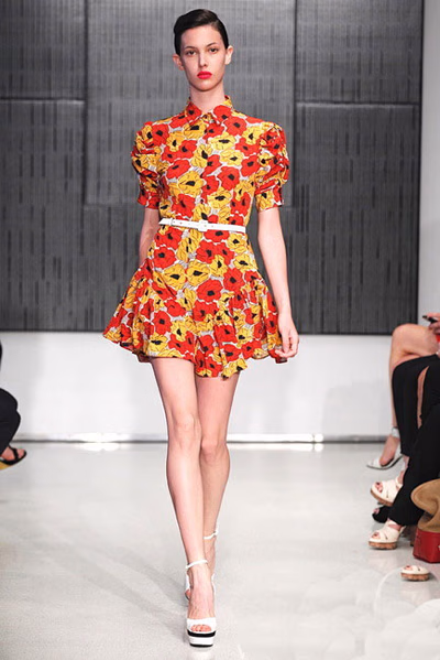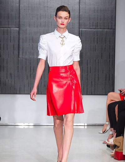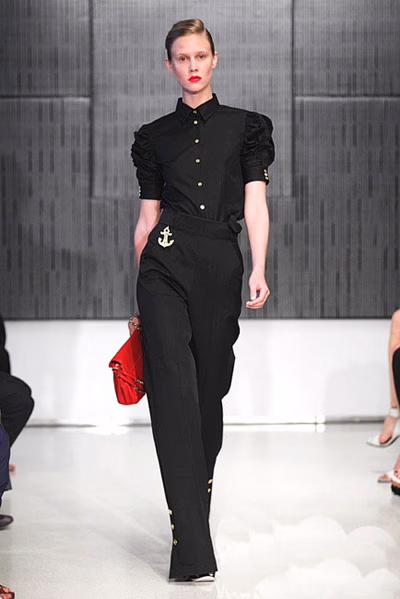 StefanoPilati(斯特凡诺-皮拉蒂)近几季的设计中总怀着向经典致敬的意味,这次,他坦言2012早春度假系列的灵感来自YvesSaintLaurent(伊夫圣罗兰)先生在1982年左右创作的航海系列。StefanoPilati用造型柔美的宫廷袖上衣、褶皱白衬衫来搭配军装式的高腰皮裙,在军装风衣的下摆裁出尖尖的花瓣形状,优雅之外仍充满了利落、强势的感觉。