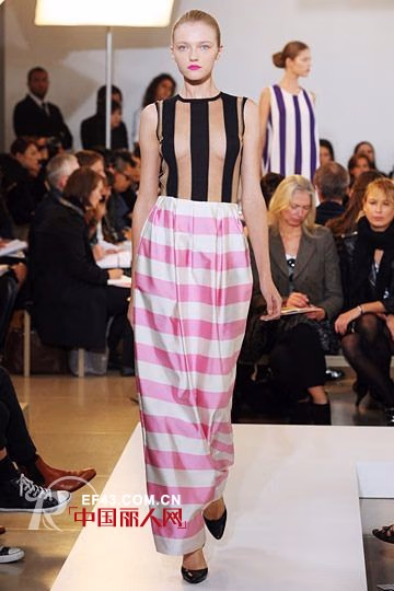 尽管Simons非常热衷于大量的细节装饰,这次他还是通过花朵和条纹来表现设计意图。背景音乐也从Bernard Herrmann的Psycho配乐转变成Busta Rhymes。模特背着超市用的塑胶袋,Freja Beha Erichsen穿着海军蓝色的大衣和无肩带日式塔夫绸裙。如此随意的奢华让我们想到了Yves Saint Laurent对于英国歌剧装扮的喜爱——当观众去这些文艺场所,比如英国南部的Glyndebourne的时候,她们就喜欢在礼服外面随便披一件风雨衣。