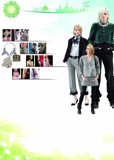 卡尔·拉格斐将男装元素巧妙融入到女装设计中,呈现出雌雄同体的新态度。经典的香奈儿斜纹软呢外套,或饰以珠片刺绣,与男式便礼服外套合为一身或与暗礁色运动外套混搭,亦或外搭一件对比色的斜纹软呢或针织斗篷。本季多款连身衣设计,加以金属亮片或菱格纹车缝效果,更饰以蕾丝刺绣,而男式阔腿长裤则被轻松卷起,露出模特的脚踝。鞋履设计上男士短靴搭配宽松袜套,乍看如鞋罩般,帅气而随性;与之形成强烈对比的是中国绉绸面料的尖头坡跟包头鞋,舒适而优雅。珠宝搭配方面,宽手镯、项链和胸针以Art Nouveau新艺术风格,以一抹亮色划破薄雾。本季香奈儿手袋设计则以柔软平滑的小牛皮装饰结构感的复古金属转扣,饰以菱格纹车缝与图形刺绣。 文/黄珊