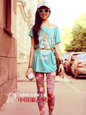 大热的天要出门逛街是个有挑战性的项目,舒适的打扮当然很重要,荧光蓝的大T恤略露小香肩,不喊性感都不可以,碎花的红色Leggings相当抢眼。最特别的是在腰间加了一条细腰带,淡黄色映衬在T恤上,红色漆皮平底鞋不但逛街舒适同样也很可爱,斜挎的包包加重了休闲的气息。