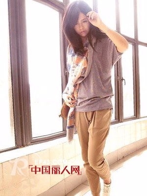 恤+裤子,是最平常不过的装扮,然而稍加小心思马上就能提升你的Fashion度,灰色蝙蝠T恤很普通,不一样的是平铺的卡通小图案。蝙蝠袖的设计可以掩盖你的胖胳膊,一条丝巾的加入迅速改变了你的休闲味,立马走起了明星范儿。