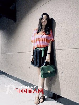 条纹是少不了的元素,好搭配、显眼、好看都是理由,撞色的流行当然也少不了它,橘色+亮粉色的宽条纹着实抢眼,这个时候简单的搭配一条黑色的短裙即可,谁告诉你们红色+绿色难看?这是多么洋气的搭配!绿色的腰带和手袋都那么美,鞋子也很是抢眼啊!