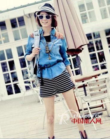 清新亮丽的海派条纹运用在短裤上,一定会吸引不少的视线。条纹可以很好的拉长腿部比例,看起来让双腿更显修长。适合腿长稍短的MM。上半身用单宁衬衫搭配,吸足人气,自然而然的也会将视线上移。