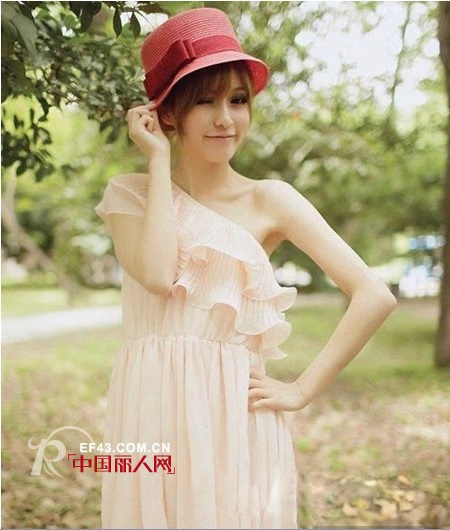 浅粉色斜肩雪纺洋装,蛋糕荷叶边设计,十分显甜美范儿哦~