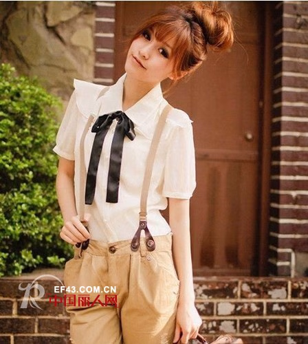 白色雪纺飘带衫搭配卡其色背带裤,瞬间搭出女孩子的利索感哦~