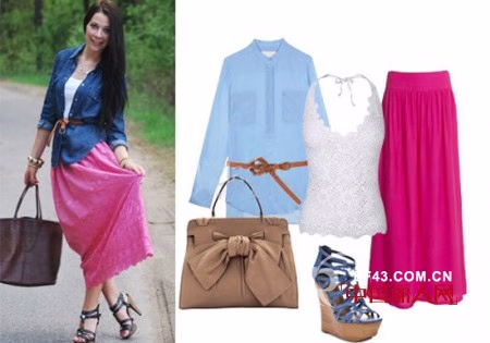 粉红色垂脚长裙配搭白色镂空吊带,干净有活力哦。粉蓝色真丝衬衫更添女孩沉稳气质。呼应色彩的绑带凉鞋增添线条感,没有可以装嫩,女人味儿绝对十足。