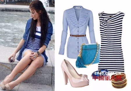 黑白条纹连身裙配搭蓝色衬衫更有法式风情。点缀糖果色包包与饰品,你的状态绝对感染所有目光!