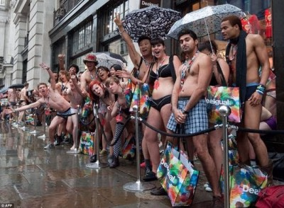 伦敦的Desigual品牌店出怪招,前100位排队的顾客可以免费得到品牌的服装,但前提是他们必须半裸排队等候。而任何身着内衣排队的顾客都可以半价购买Desigual品牌的夏装系列。