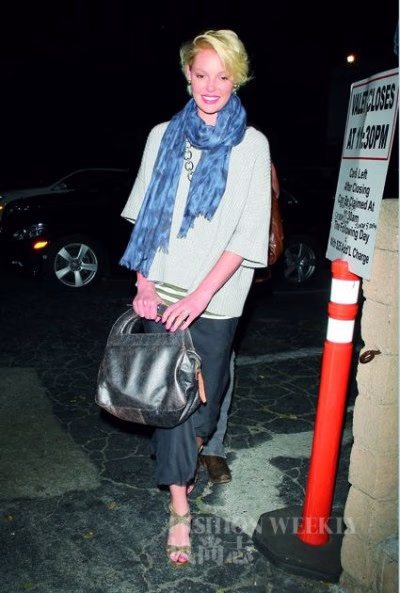 Katherine Heigl这套装扮中的七分裤宽松飘逸,有今夏的流行元素且与上身的针织套衫对应,看到她套衫下的紧身条纹衫没?这样过渡轮廓会显得整体造型松而不散。这是去机场时一定要尝试的新造型。