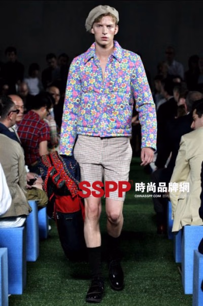 米兰2012春夏男装:Prada(普拉达)2012春夏男装秀发布男装以依旧大量挥洒色彩和金属宝石铜钉,西部印花牛仔衬衫配满身宝石钉的款式。崇尚简约的普拉达在运用色彩城市流行色,模特们身着套装,系着领带,提着公文包。这些套装采用丝绸材料,但特别的印花效果使其看起来像是斜纹呢。修身剪裁的上衣、短瘦的裤子、白衬衫、窄领带、尖头皮鞋,劲显都市男性风采。