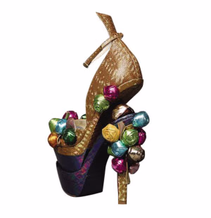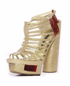 自从女人的鞋子跨入装饰品行列那一天,珠宝的点缀也已变得平庸无奇了。无论是跳跃的色彩、玩味的造型,还是千奇百怪的材质组合,仿佛都在讲述着一个女人的华丽蜕变。亚历山大·麦昆 (Alexander McQueen)2011春夏新款鞋履充满浪漫的自然气息,麦穗装饰在鞋的脚踝处,鞋跟用不规则的蔓藤植物代替,鞋尖停留艳丽的蝴蝶,大量的蛇纹与热带植物叶子装饰让强势的“恨天高”充满曼妙的仙踪气息。