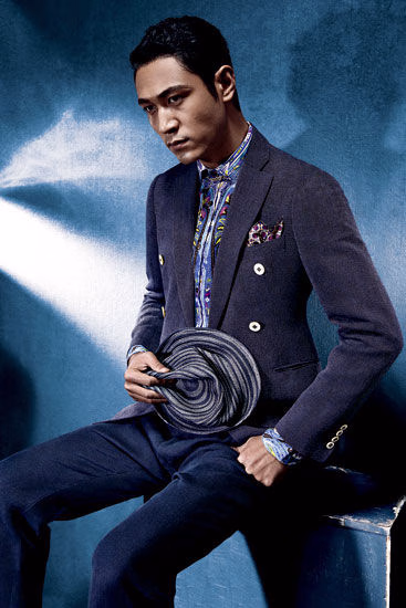 西服 Giorgio Armani 印花衬衫 Etro at Joyce 裤子 Salvatore Ferragamo 口袋巾 Zara 帽子 Replay