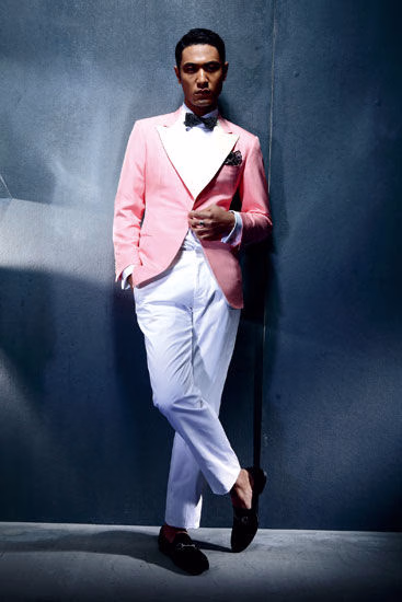 粉色礼服 Kiton 白色衬衫 Boss Selection 白色裤子 Boss Black 领结 Etro at Joyce 口袋巾 Zara 鞋子 Gucci