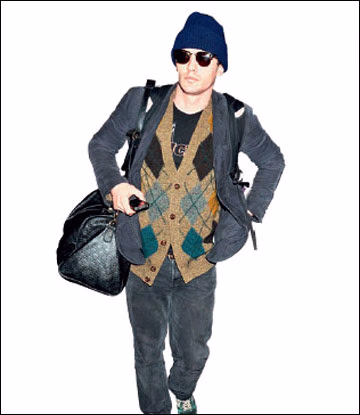 小眼哥德这身打扮和他之前帅气笔挺的扮相出入很大。不过这一身灰蓝色中透出一些毛茸茸的菱格纹和一顶针织帽的景象,立马又有些说不出的惊喜感——奇趣怪异的背包客。