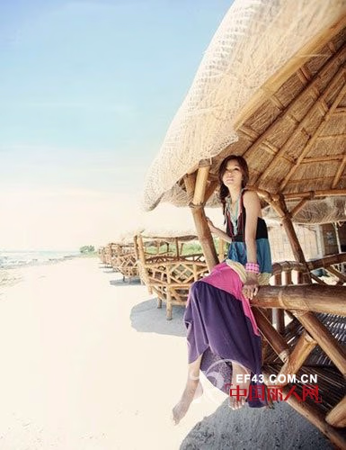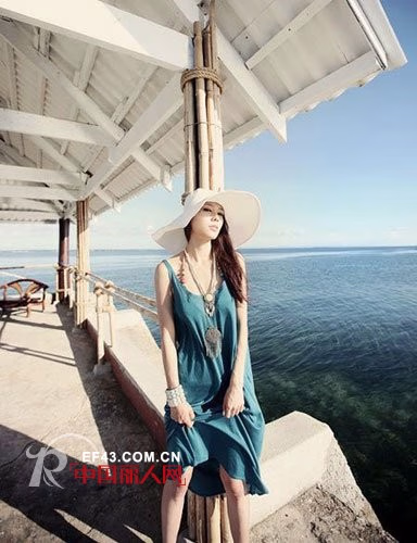 夸张的饰品带出浓郁的民族风,白色宽檐草帽必不可少。海蓝色的连衣裙,材质飘逸柔软,适合在海边度假时穿着,夸张的饰品带出浓郁的民族风,白色宽檐草帽必不可少。