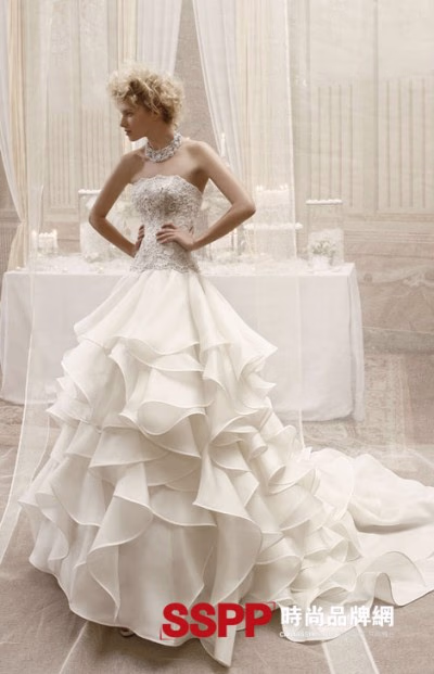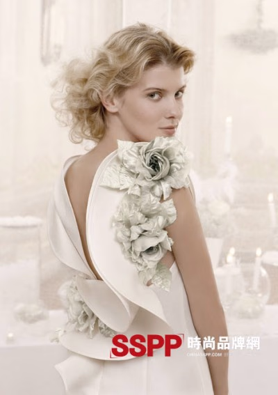 清新自然的绿,AtelierAimée2012婚纱礼服系列,将不同的绿色花朵印上裙身,腰间清新绿色花朵,复古新优雅。大大的蝴蝶结头花,清新淡然,前短后长的不对称裙摆更显得轻盈活泼。裙身选择了淡绿色的缎面,皱褶出大大的花朵裙摆……藏在细处的唯美细节,让浪漫礼服更加动人。
