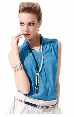 实验证明,蓝色给人冷静稳重,值得信赖的感觉,是最能提升职场好感度的颜色。这款蓝色的小衫无袖宽松面料穿起来特别的清爽舒适,独特的交织银线工艺让蓝色的衣服微微透出光亮,衬托白皙的皮肤。让你在职场中获得最佳的人缘。