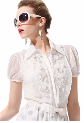 白色代表纯洁,干净,给人较强的亲切感,职场中随处可见白色的衬衫,而这款白衬衫则会让你一下从人群中跳脱出来。100%真丝成分的面料,透气性好;前襟采用亮片,水钻和胶花的装饰,把普通的一件白衬衫变得浪漫而富有艺术感。