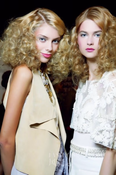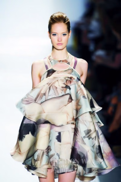 2011春夏飘逸的轻纱带来唯美的透视诱惑,这季的透视并非赤裸裸地露出里面的所有,而是将百般诱惑跳tone至性感的腿部。用蕾丝、缎面拼接轻纱的荷叶边,将关键部位巧妙地遮掩住,从轻盈的纱裙里隐约透出双腿,在曼妙的黑色、优雅的裸色下,将性感进行到底!蓝色的烟熏眼妆充满魅惑风情,重点选择啫喱质地,搭配轻盈的荷叶边格外引人注目。双唇只用唇蜜点亮就好。