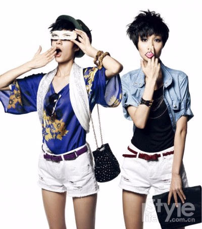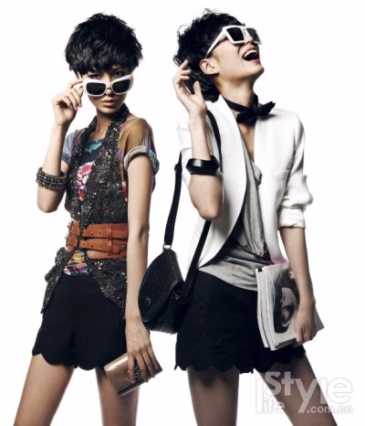 左 A面:撕边超短裤搭配带有印花的真丝上衣,宽大的肥袖子与紧俏的超短款式相呼应。前卫与民族的混搭恰到好处地碰撞出时髦亮点。