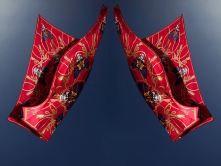 在天空色背景的衬托下,Alexander McQueen(亚历山大·麦昆)2011夏季的方巾、披肩仿佛有了生命,像一群美丽的蝴蝶翩翩起舞,经典的骷髅头图案、浓墨重彩的金色线条、淡淡晕染的水墨印花在夏日的清风中飘动,轻盈的身姿承载着独特的华丽感与精彩的创意。