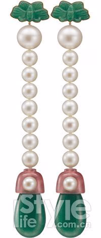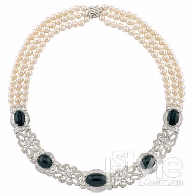 珍珠、钻石、墨翠结合而成的颈链,时尚典雅,其中颜色较深的翡翠并不觉得暗沉,反而成为了点睛之笔,搭配新娘礼服,绝对美艳无比。
