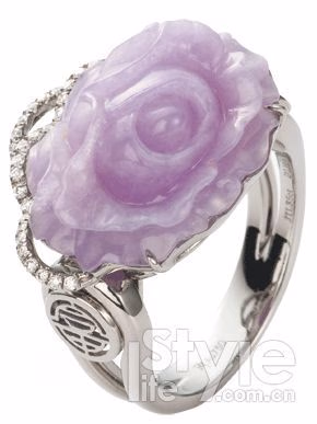 紫色的翡翠玫瑰花娇艳欲滴,温润诱人,搭配璀璨的钻石映衬出新娘的迷人。