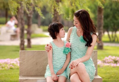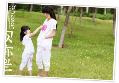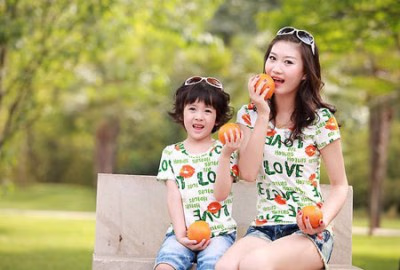 公主与王后特别推出的2011夏亲子装T恤之一!清爽,充满夏日清凉的感觉,洁净的白色,上面分布浅绿色英文,大大的墨绿色“LOVE”,橙色的唇形,好像宝宝在张口对妈妈说:妈妈,我爱你!