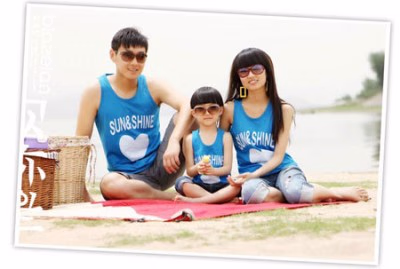 镜头一:河边野餐一家三口蓝色背心装很抢眼