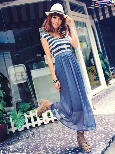 昕薇杂志推荐的一款超长连衣裙,高腰设计 上身为条纹 带有省道设计 十分修身显型,腰部带有蓝色宽宽的松紧带裙身拼接蓝色雪纺纱飘逸又十分唯美,后领口为深U型设计 带有透明的安全带 方便固定领口大小 十分考究和经典哦!肩部有垫肩设计整件衣身都是十分显高显瘦的,优质的面料设计及为亲肤、舒适、透气。