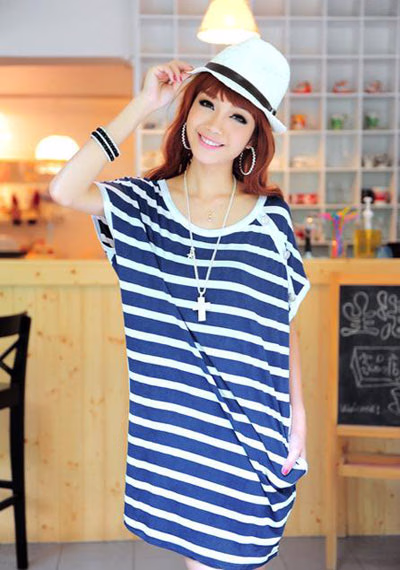 英伦复古范儿,经典的海军条纹,中长的款式,上为宽松的蝙蝠短袖,下面插兜略收剪裁设计,当T恤裙来穿,纽扣点缀带来小不同。丝光棉,手感凉凉的很光滑,有垂感不贴身,非常适合夏季穿着。