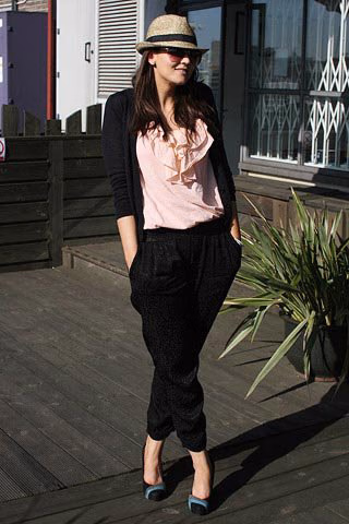 黑色豹纹哈伦裤少了一些野性,多了些低调奢华感,搭配女性气质浓厚的开衫、粉色荷叶边背心,显得既随意又时髦,再带上墨镜和草帽,非常适合徜徉在6月街头。