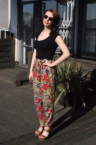 凉鞋: Primark,印花裤:慈善店铺 ,黑色T恤: H&M ,豹纹戒指:Spitalfields,蛇形戒指: vintage