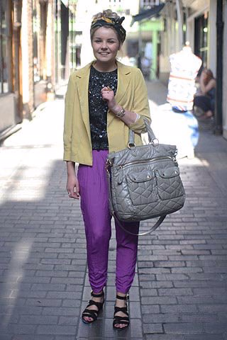 紫色哈伦裤与姜黄色夹克的撞色搭配引人注目,再加上包头巾、黑色绑带凉鞋、亮片背心和灰色绗缝手袋的配合,整体造型充满浓郁的异域风,是6月街头非常美丽的一道风景。