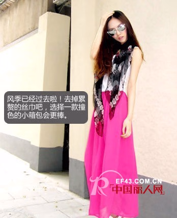 玫红色雪纺长裙闪到小编了,但还是不自觉的想多几眼,白色的背心就足够搭配了,记得掖进裙子里面,这样才够复古范儿。鞋子上面还是选择白色比较合体,因为白色并不是一个低调的颜色,在用过于花俏的鞋子,会影响玫红雪纺长裙的小浪漫,配上你的大长发,美死了!