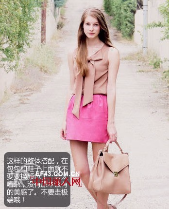 上班族的MM不用发愁总和黑白灰打交道啊,玫红色的中腰裙必定是中心,有些腰间的褶皱花苞状可以很好的修饰腰间和胯部的比例线条,裸色当然是不会出错的,胸前的大蝴蝶结映衬了枚红色带来的跳跃,活泼的在胸前展示自己的美。