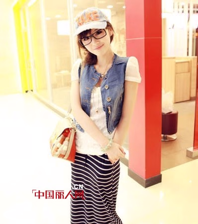 黑色系为主的横条状长脚群,可以显得下身修长,既能遮住臀部大腿处的肉肉,动感中满是时尚气息。配上牛仔的背心,修长的身材展露无疑。