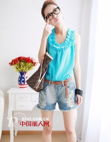亮亮蓝色的雪纺上衣明艳生动,加上花边儿领口设计精致华丽,更有女人味,宽松的版型不挑身材,搭配一条磨破的牛仔短裤,轻松惬意。
