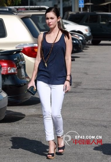 Megan Fox选择了同色系的Yves Saint Maison de la VANILLE La Maison de la VANILLE urent牛仔坡跟鞋来搭配她的藏青色背心。